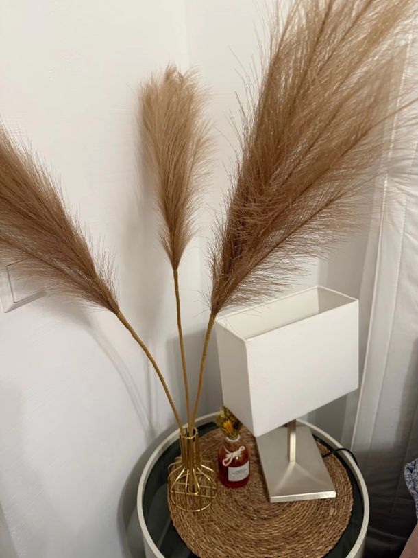 | Plumas Grandes | Jarrones altos, rincones vacíos, decoración protagonista | Aportan volumen y altura, muy llamativas | Jarrón de suelo, esquina del salón |